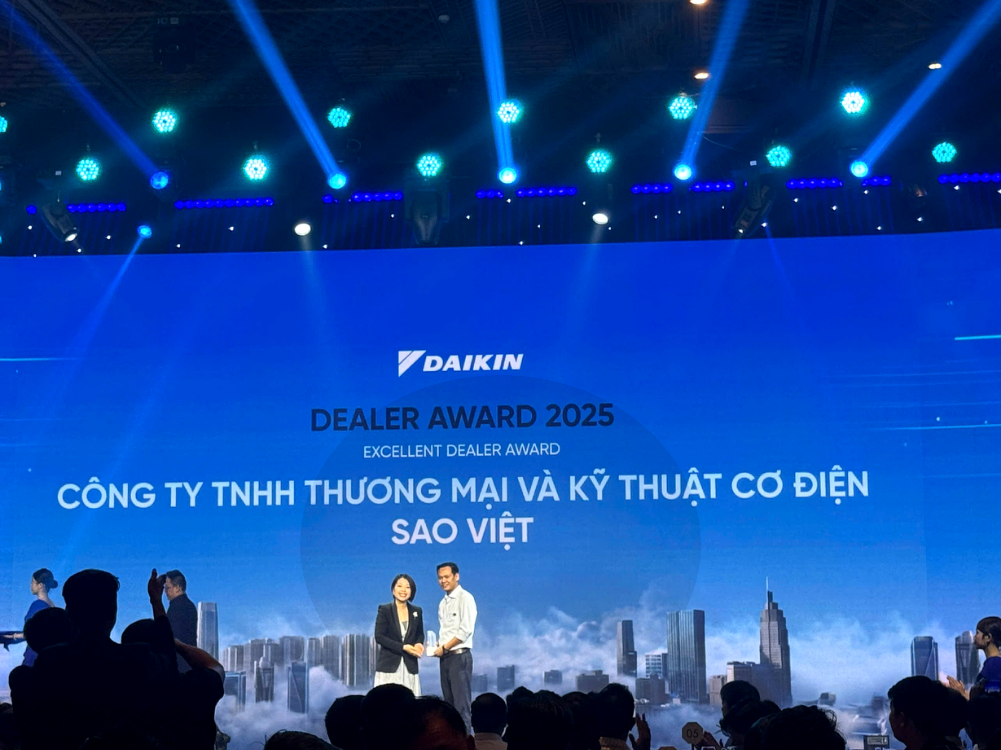 CÔNG TY TNHH THƯƠNG MẠI VÀ KỸ THUẬT SAO VIỆT trân trọng thông báo đã vinh dự được trao tặng giải thưởng “Excellent Dealer Award” tại chương trình Daikin Dealer Award 2025 – một trong những giải thưởng danh giá dành cho các đại lý có thành tích nổi bật trong hệ thống phân phối của Daikin.