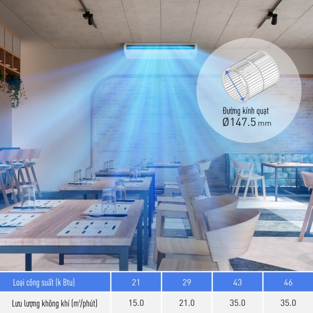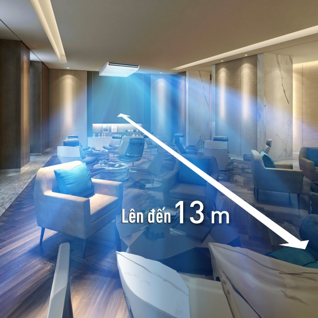 ối ưu hình dạng của vỏ ngoài và quạt tạo ra luồng khí lớn hơn. Luồng khí mạnh mẽ được thổi đi ngay lập tức khiến toàn bộ không gian trở nên dễ chịu và mát mẻ. Hình dạng của cổng thoát khí được tối ưu hóa giúp phân bổ luồng không khí trên khoảng cách xa. Không khí mát lạnh có thể vươn xa tới 13 mét* phù hợp với cả không gian sâu và rộng.
