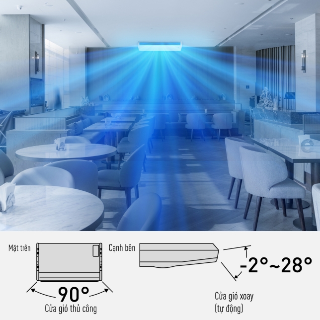 Bên cạnh cửa gió rộng, các cánh đảo gió có thể điều chỉnh bằng tay 90 độ trái phải và tự động lên xuống 30 độ. Bạn có thể lựa chọn điều chỉnh hơi mát lan tỏa khắp không gian rộng hoặc chỉ điều chỉnh hơi mát đến hướng bạn muốn. Thiết kế siêu mỏng, nhỏ gọn dễ dàng lắp đặt. Khi không hoạt động, cánh đảo gió đóng lại để mang đến vẻ ngoài trang nhã trong khi vẫn giữ cho thiết bị luôn sạch sẽ.
