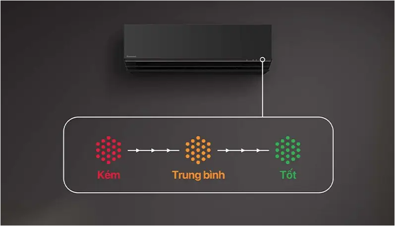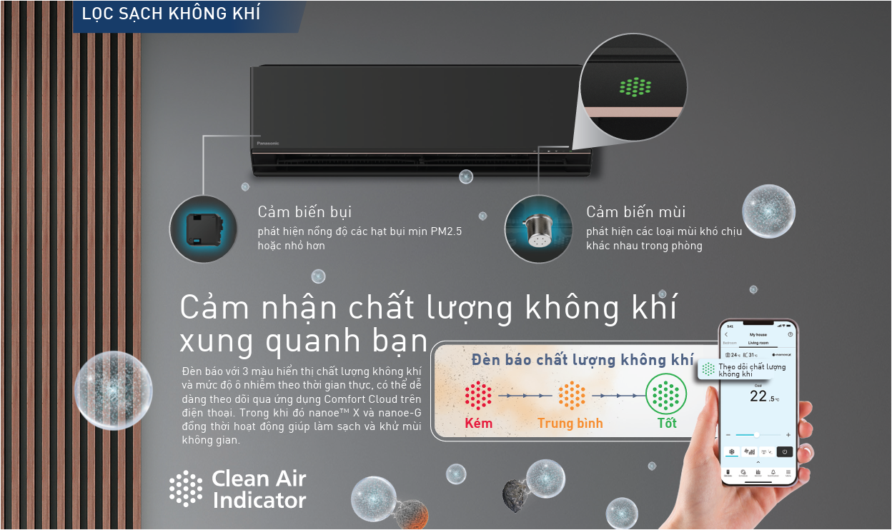Điều hòa Panasonic Premier Edition tích hợp đèn báo chất lượng không khí với 3 màu sắc, giúp bạn dễ dàng cảm nhận chất lượng không khí xung quanh bằng các mức độ ô nhiễm theo thời gian thực. Đèn báo Chất Lượng Không Khí hiển thị theo thời gian thực, giúp bạn nhận biết không khí xung quanh, đồng thời công nghệ nanoe™ X giúp lọc sạch và khử mùi hiệu quả. Nhờ tích hợp Wi-Fi, bạn có thể điều khiển điều hòa mọi lúc, mọi nơi qua ứng dụng Panasonic Comfort Cloud