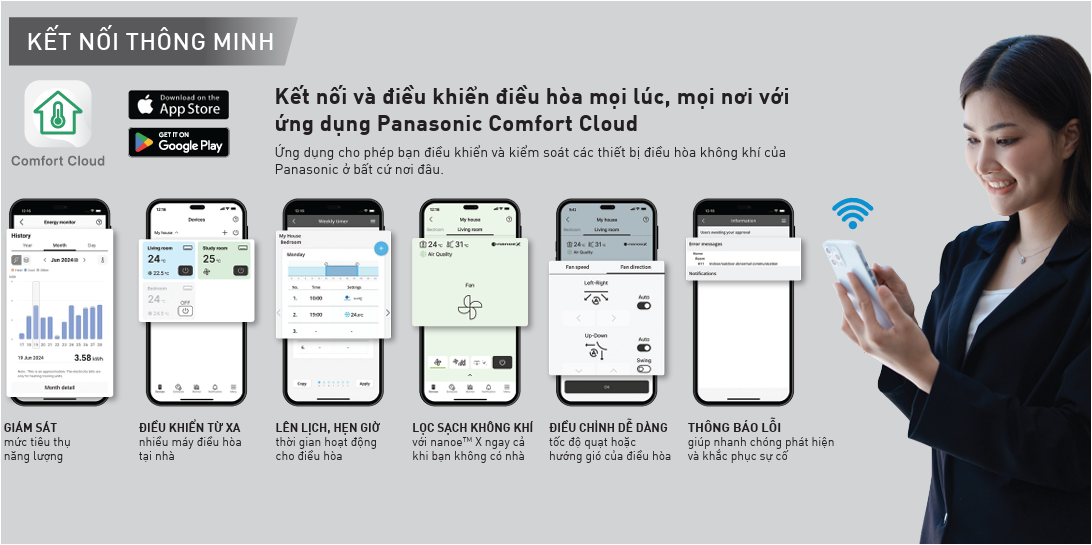Thỏa sức điều khiển điều hòa ngay cả khi bạn không có mặt, chỉ với ứng dụng Panasonic Comfort Cloud trên điện thoại thông minh hoặc máy tính bảng của bạn. Ứng dụng có thể kết nối và điều khiển nhiều thiết bị ở nhiều phòng khác nhau phù hợp với nhu cầu của bạn. Giám sát việc sử dụng các thiết bị điều hòa thông qua số liệu thống kê điện năng tiêu thụ và xác định sự cố nhờ các thông báo lỗi trên ứng dụng để khắc phục sự cố dễ dàng.