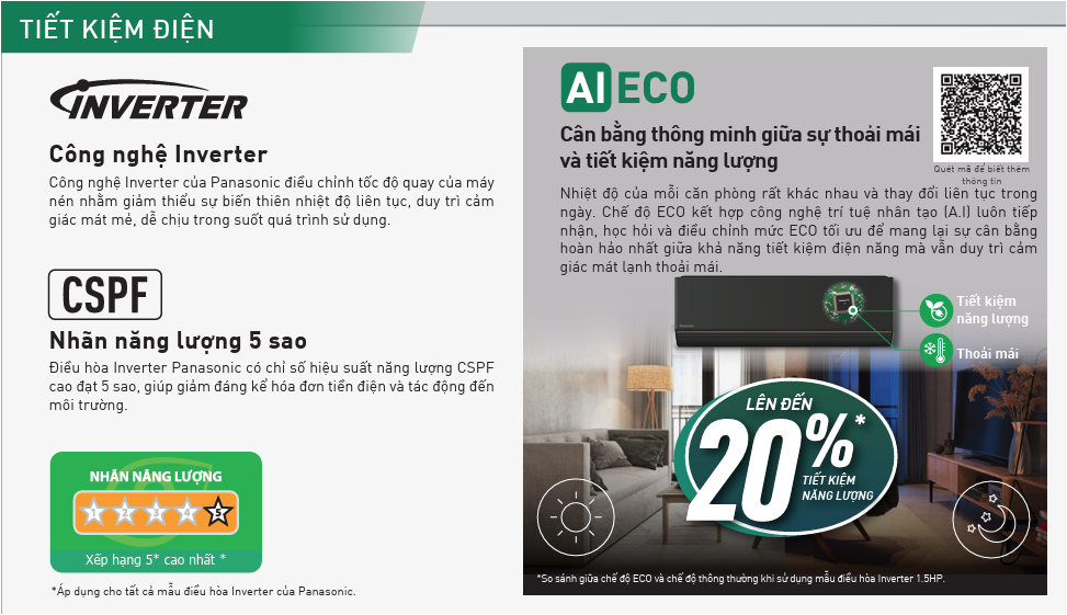 Hiệu quả sử dụng điện năng tối ưu nhờ các công nghệ thông minh như Chế độ ECO tích hợp trí tuệ nhân tạo (A.I.) và công nghệ Inverter – giúp tiết kiệm năng lượng và giảm chi phí. Điều hòa Inverter Panasonic có chỉ số hiệu suất năng lượng CSPF cao đạt 5 sao, giúp giảm đáng kể hóa đơn tiền điện và tác động đến môi trường. Không những thế Panasonic còn cân bằng thông minh giữa sự thoải mái và tiết kiệm năng lượng. Mỗi không gian có nhiệt độ khác nhau và thay đổi suốt cả ngày. Chế độ ECO tích hợp Trí tuệ nhân tạo (A.I.) luôn tiếp nhận, học hỏi và đánh giá mức ECO tối ưu để tiết kiệm năng lượng tối đa lên đến 20%* đồng thời mang lại sự mát lạnh thoải mái ổn định. Công nghệ Inverter của Panasonic sử dụng bộ vi xử lý kết hợp với máy nén mạnh mẽ có độ ồn thấp để kiểm soát nhiệt độ chính xác, mang lại môi trường thoải mái mà vẫn tiết kiệm năng lượng.