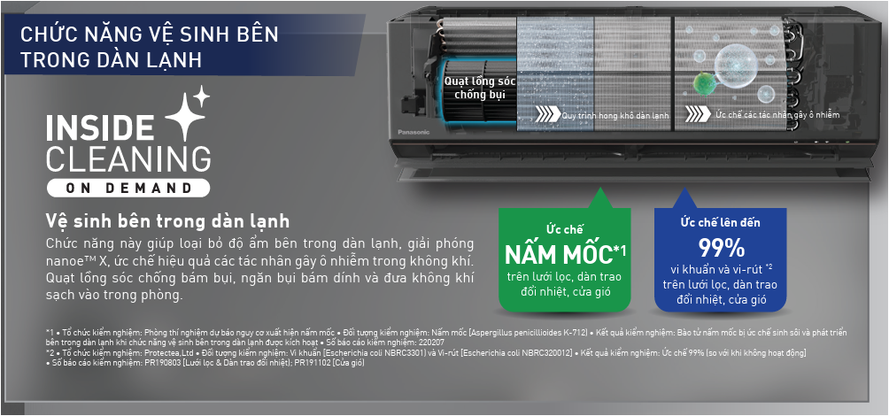 Máy lạnh Panasonic CU/CS-AU09BKH-8 Inverter 1.0 HP có Chức năng Vệ sinh bên trong dàn lạnh giúp loại bỏ độ ẩm và giải phóng các hạt nanoe™ X, ức chế các chất gây ô nhiễm khác nhau trong khi vẫn đảm bảo bên trong dàn lạnh luôn khô ráo và sạch sẽ. Kích hoạt chức năng một cách dễ dàng bằng cách bấm và giữ nút nanoe trên điều khiển. Quạt lồng sóc được phủ lớp đặc biệt ngăn ngừa bụi bám dính đảm bảo luôn sạch sẽ. Có hiệu quả trong việc loại bỏ 99% các hạt bụi*, nanoe-G giải phóng ra các ion âm để bắt giữ các hạt bụi có kích thước nhỏ như PM 2.5, đưa chúng trở lại bộ lọc giúp mang lại không gian trong nhà trong sạch hơn.