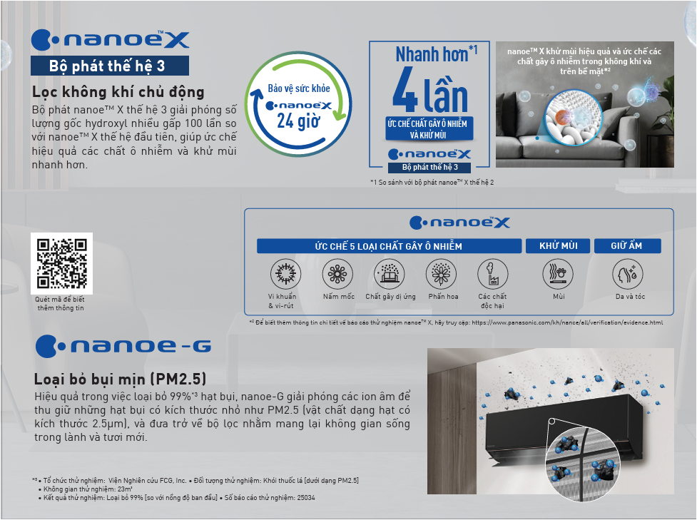 Máy lạnh Panasonic CU/CS-AU09BKH-8 Inverter 1.0 HP Được trang bị bộ phát nanoe X thế hệ 3 mới nhất mang lại hiệu quả cao hơn trong việc ức chế các chất ô nhiễm khác nhau và khử mùi hôi với tốc độ nhanh hơn 4 lần so với bộ phát nanoe X thế hệ 2 trước đây. Nanoe™ X đã được xác minh có khả năng ức chế hiệu quả lên đến 95% các hydrocarbon thơm đa vòng (PAHs) có trong bụi mịn PM2.5, là một thành phần của bụi mù.