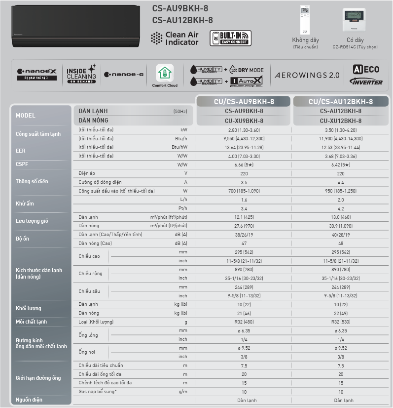 Thông số kỹ thuật Máy lạnh Panasonic CU/CS-AU09BKH-8 Inverter 1.0 HP